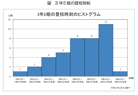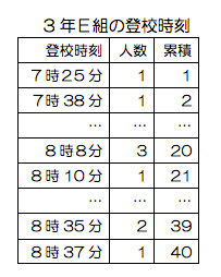 ここでは、なるほど統計学園の3年E組の登校時刻の調査結果を利用して考えることにしましょう。