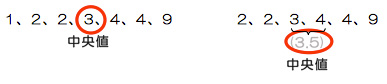 中央値(メディアン;)は、母集団の分布の中央にくる値のことです。変量の個数nが奇数の時は真ん中の値を取りますが、偶数のときは真ん中の2つを加えて2で割った値となります。中央値より大きい値の個数と小さい値の個数は同数となります。